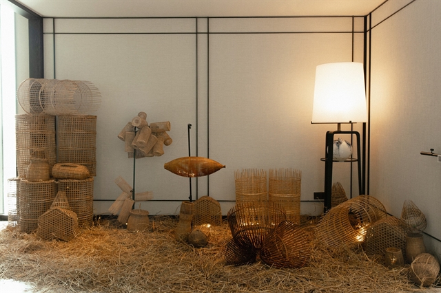 A highlight of the exhibition is a work by artisan Chiến, entitled Derivative Grouper Trap & Heritage in Continuum. Inspired by the traditional fish trap, a symbol of the 300-year-old fishing craft of Hưng Học Village in Quảng Ninh Province, it is entirely handcrafted from bamboo. Inside the trap sits a chocolate-sculpted song (spotted grouper), a delicacy that is a signature of Vân Đồn Island in the province, blending craftsmanship with creativity.