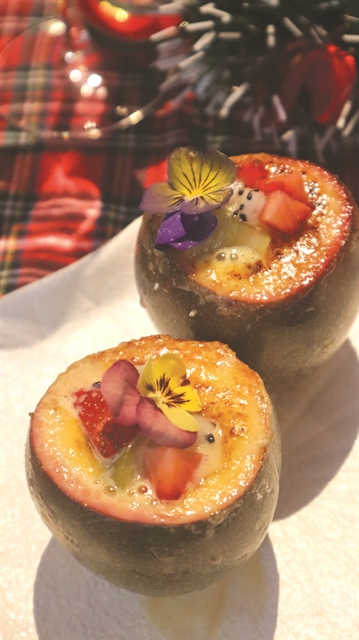 To embark on my culinary journey, I selected pumpkin soup, crispy fried pastries filled with shrimp paste, smoked salmon, fried fish with herbs and passion fruit brulee for dessert.