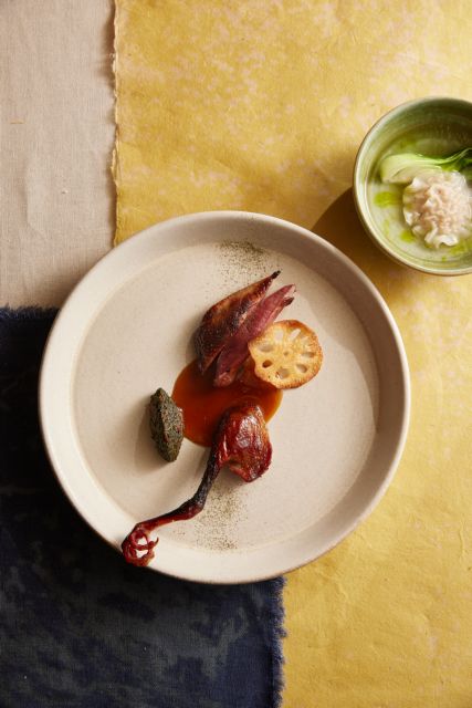 Pigeon, Clausena indica and wontons. Photo courtesy of Vien Dining