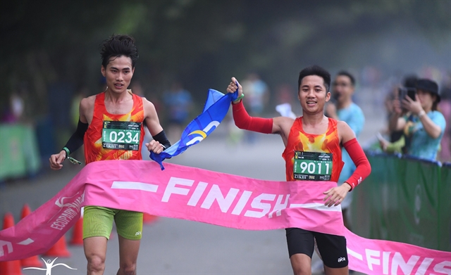 Nguyễn Quốc Anh (right) and Lê Tiến Long run to finish line at nearly same time. Organisers recognise Anh the winner of the men's 21km of the Ecopark City Trail 2025. Photos of organisers