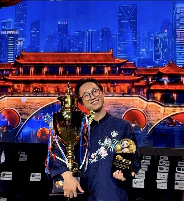 Nguyễn Đức Hiếu holds his trophy at the Chengdu International Grand Finals of the Asia-Pacific Arts Festival in China last month. Photo courtersy of Hiếu
