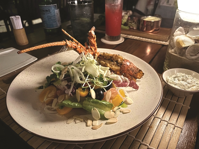 A pamphlet with picture of the lobster salad suggests to diners to try this club's signature dish. Named Khánh Hòa lobster salad (VNĐ700,000), it was a well-balanced mix of crispy green and purple lettuces, citrus fruits such as mandarin and grapefruit, black olives and golden almond slices, topped with the salad dressing of garlic, thyme, vinegar and mayonaise.