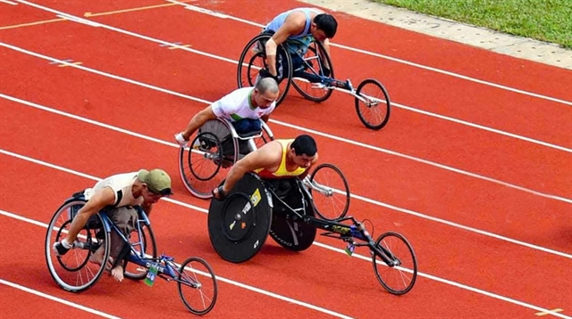 Nguyễn Văn Bích (left) competes in the wheelchair category at a national sports championship. Photo courtesy of Bích