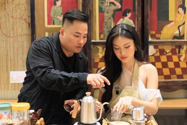 Culinary expert Lê Hòa and Miss Universe Việt Nam 2025 Nguyễn Hoàng Phương Linh instruct workshop participants how to make coffee while sharing their personal stories. Photo courtesy of M.O.M Cooking Class