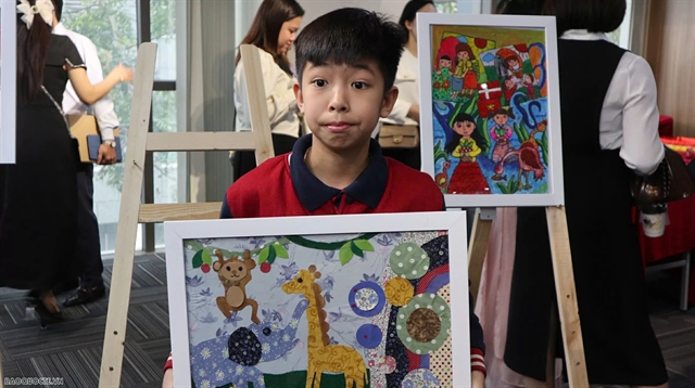 The top prize went to Nguyễn Hoàng Thịnh, a 6th grade student from Hà Nội Victoria School. His award-winning painting Green World - Green Future, was created from fabric scraps.