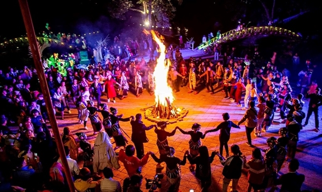 Tourists and locals dance together at a campfire at night. — Photo dulich.laichau.gov.vn