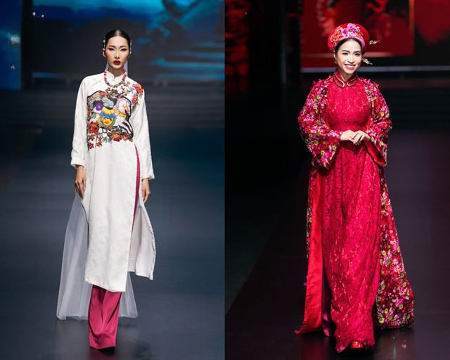 The collection also highlights áo dài (Vietnamese traditional dress) embroidered with Vietnamese traditional patterns such as horse, peacocks, đào (cherry blossom), and chrysanthemum.