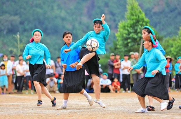 Sán Chỉ ethnic women in Bình Liêu District, Quảng Ninh Province, compete for possession of the ball during a football match. Photo binhlieu.travel