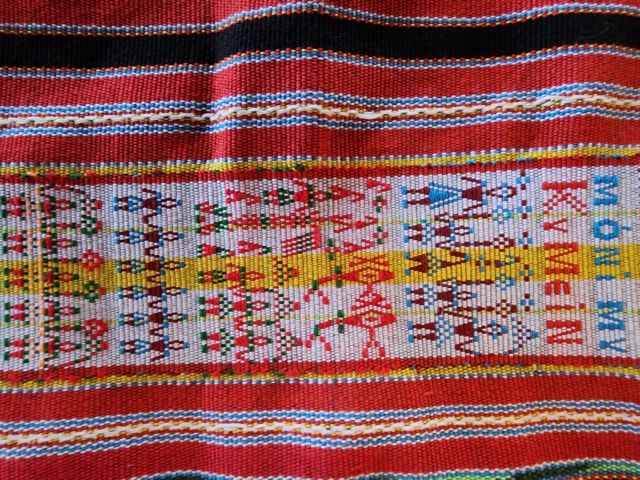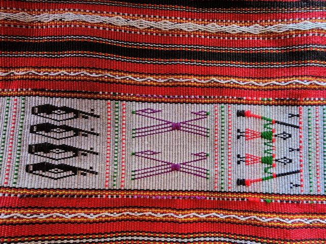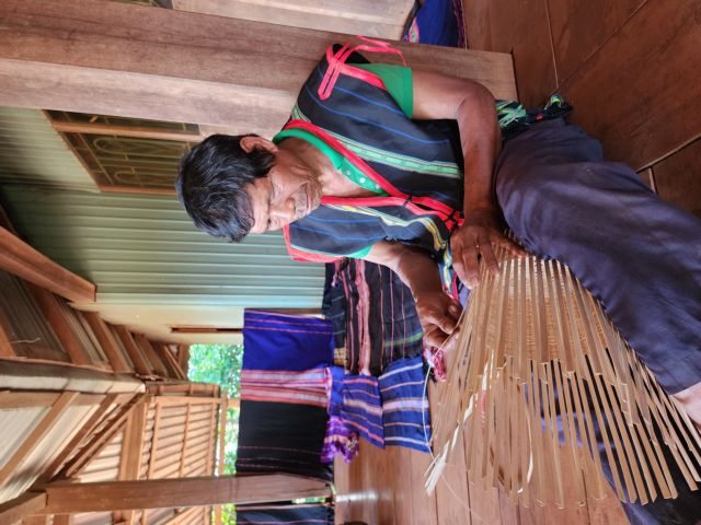 She says that Gia Rai weavers use cotton dyed with natural pigments derived from local plants with indigo for black, turmeric for yellow and tơ-nưng for red.