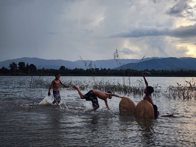 Three children catch fish in a lake near their village. VNS Photo Lê Việt Dũng