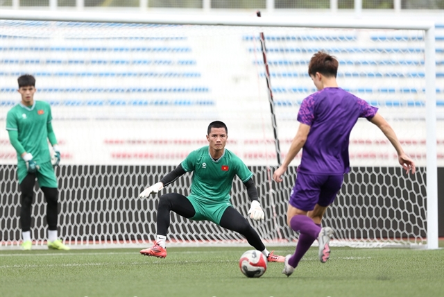 Goalie Nguyễn Đình Triệu in a training session during the ASEAN Cup 2024.