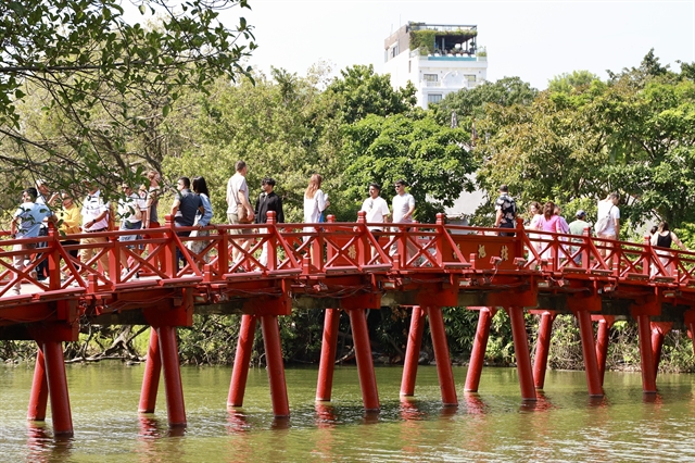 Tourists cross Thê Húc Bridge, which spans Hoàn Kiếm (Sword) Lake. — VNA/VNS Photo by Vân Chi
