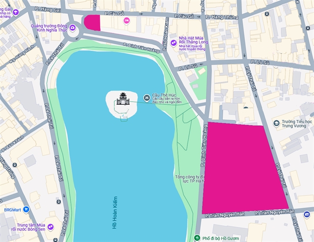 Plans are underway to renovate and expand Đông Kinh-Nghĩa Thục Square, along with the eastern area of Hoàn Kiếm Lake (marked in pink). Image Google