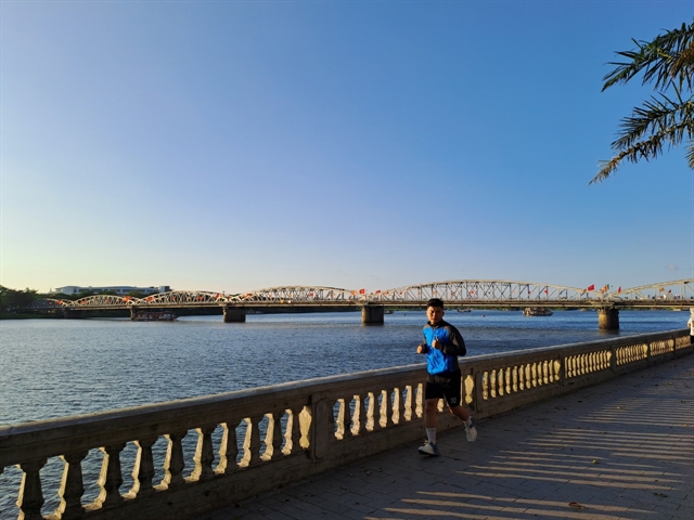 A runner checks a track on the Hương River bank in Huế City. The city will host the fifth VnExpress Marathon on April 6. VNS Photo Công Thành