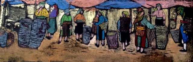 A fair in mountainous area, a wood carving by Trần Thị Cúc. The work is displaying in an exhibition by Cúc and her husband in Paris, France.