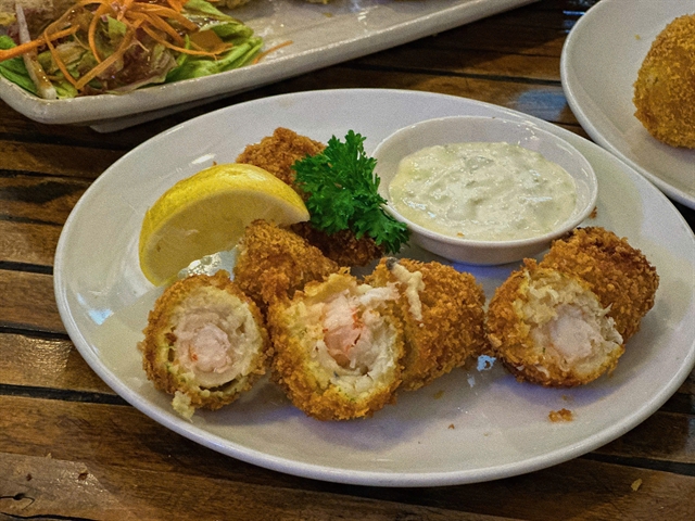 Nostalgia accentuated further when doused in lemon and smothered with tartar sauce. The aforementioned poppers were chunky, bon-bon pockets of meat, cheese and spice, breadcrumbed tightly to hold them together. A hit.