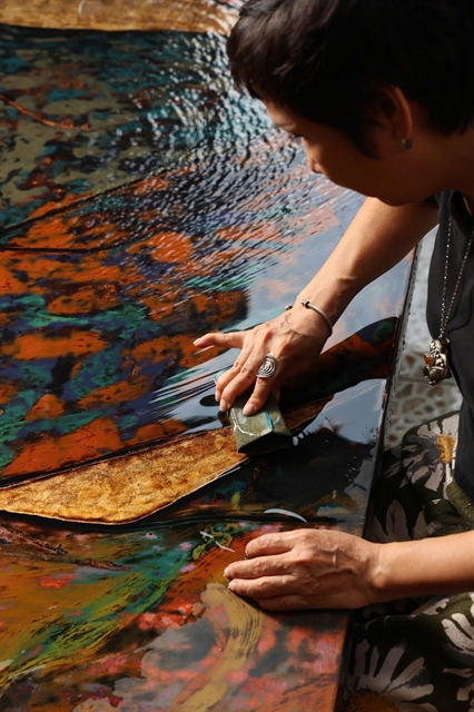 Hiền Nguyễn works on a lacquer painting. — Photo courtesy of the artist