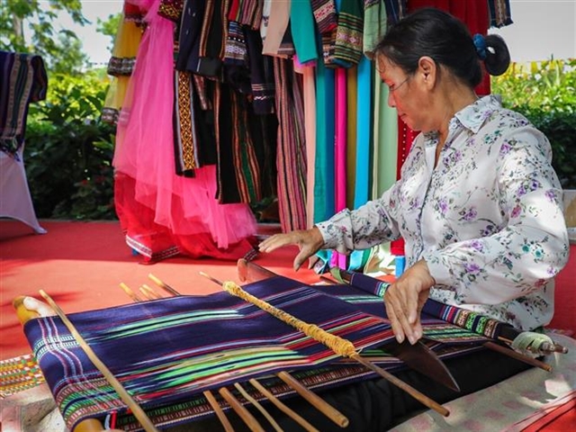 An artisan demonstrates handloom weaving during the Lâm Đồng Cultural Day in Hà Nội. -- VNA/VNS Photo
