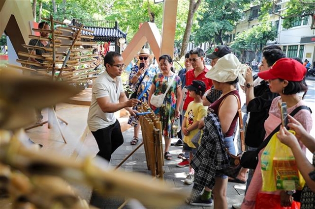 Visitors watch a musical performance by Lâm Đồng artists using their traditional instruments during the Lâm Đồng Cultural Day in Hà Nội. -- VNA/VNS Photo