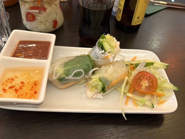 We browsed the menu, which featured authentic Vietnamese dishes. Starters included summer and spring rolls (£10.95/US$14.75), sugarcane prawns (£14.95), the classic stir-fried morning glory (£18.95), and pak choi, a Chinese-style stir-fry (£18.95). In Vietnamese đồng, the morning glory dish would cost about VNĐ670,000 – roughly 10 times more expensive than the same dish back in Việt Nam.