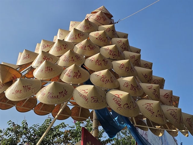 A giant conical hat installation measuring 6.5 metres in height and four metres in diameter is assembled from 103 traditional hats representing wards and communes in Cần Thơ.