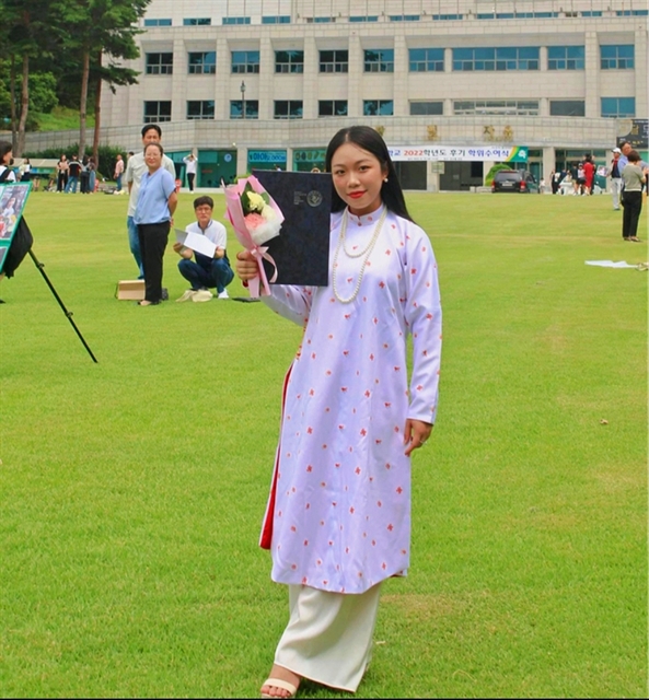 GRADUATED: Phạm Hồng Nhung, a graduate from Daegu University in International Education, wears a traditional five-flap long dress during her graduation ceremony. Photo courtesy of Hồng Nhung