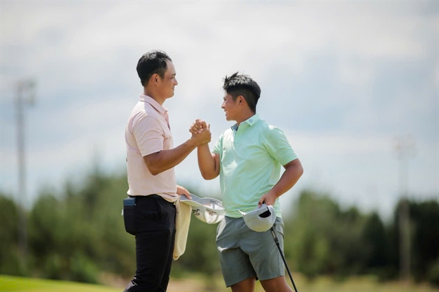 Nguyễn Tuấn Anh and Trương Chí Quân after the National Golf Championship playoff. -- VNS Photo Thảo Anh