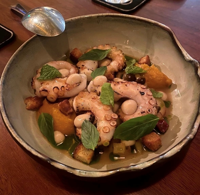 I ordered Autumn octopus (VNĐ260,000) with pumpkin-miso purée, bacon, mushrooms, brown butter croutons and green apple in the middle of summer and thought, “Did I miss a seasonal memo?”. Then the pumpkin purée hit: sweet, cosy, and suddenly I was wearing a flannel shirt in my mind.