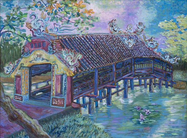 Sunset on Thanh Toàn Tile Bridge, oil on canvas by Lê Trang.