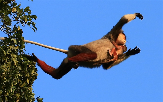 A photo captures the moment a female red-shanked douc langur (Pygathrix nemaeus) jumps from a treetop while holding its baby in the Sơn Trà Nature Reserve. Photo courtesy of Bùi Thanh Lang
