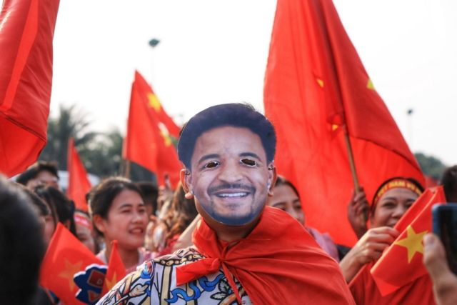 A football fan wearing a mask of striker Nguyễn Xuân Son welcomes the team home. VNA/VNS Photo Tuấn Anh