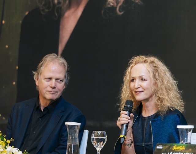 Norwegian composer and pianist Rolf Løvland and Irish violinist Fionnuala Sherry speak with local media on Friday morning. Photos courtesy of Nhân Dân newspaper