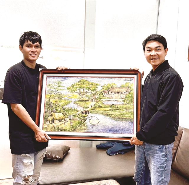 AMAZING ART: Y Êli Buôn Krông (left) is pictured with one of his loofah paintings. Photo courtesy of Y Êli Buôn Krông