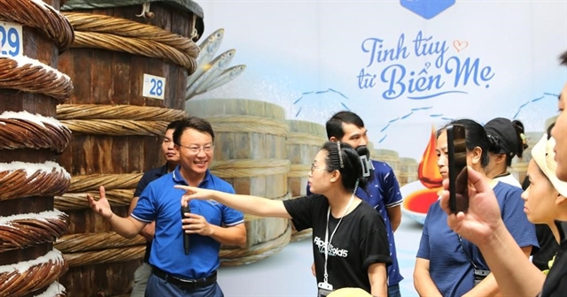 Visitors learn about the fermentation process of Lê Gia fish sauce. — VNA/VNS Photo