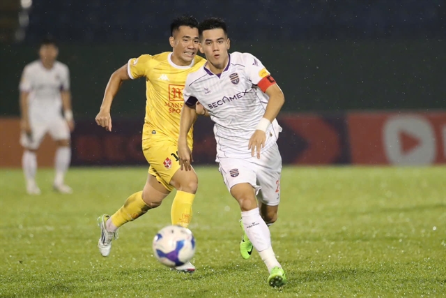 Becamex Bình Dương captain Nguyễn Tiến Linh (right) is leading the V.League 1's scoring table with nine goals after 13 matches.