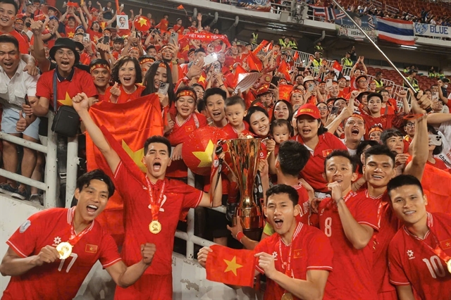Nguyến Tiến Linh (second, left) and teammates and Vietnamese supporters celebrate Việt Nam's ASEAN Cup victory. VNS Photo Minh Quyết