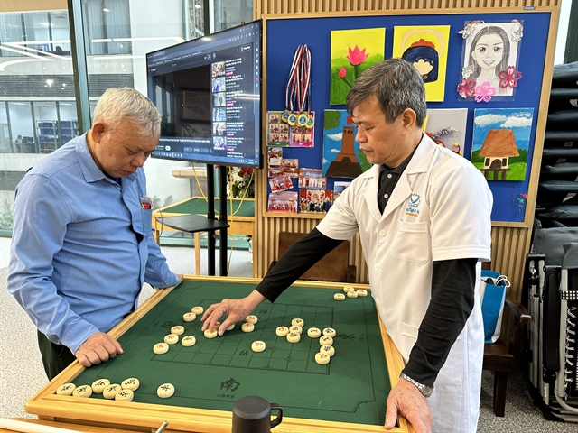 Vũ Hải Chi (left) plays Chinese chess with a doctor at Nhân Ái Daycare. VNS Photo Lê Hương