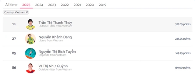 Joining her among the world’s elite is teammate Vi Thị Như Quỳnh, who was placed 29th overall. Several other Vietnamese players made the top 100, reflecting the country’s growing strength in international volleyball.