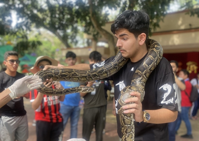 A foreign tourist at the Đồng Tâm Snake Farm in Châu Thành District. – VNA/VNS Photo