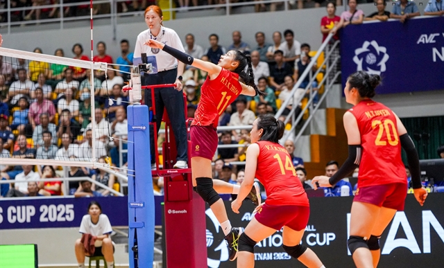 Vietnamese athlete Hoàng Thị Kiều Trinh (No 11) tries to hit the ball during a match at the AVC Nations Cup last week in Hà Nội. Việt Nam will take part in the VTV Ferroli Cup from June 28 to July 5 in Vĩnh Phúc.