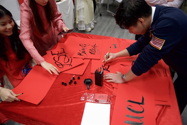 Photo zones featuring Vietnamese landscapes, conical hats and traditional áo dài attracted many students, while cultural activities such as giving lucky money, fortune drawing for the New Year, calligraphy writing and traditional folk games further enhanced the Tết atmosphere amid the British winter.
