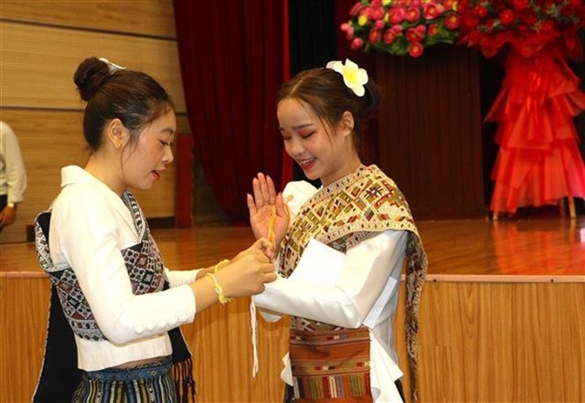 International students perform the ritual of tying string 'bracelets' on the wrists of others for good luck.— VNA/VNS Photo