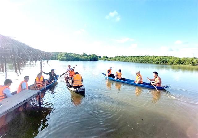 Visitors enjoy a rowing boat trip through the mangrove forest in Bảo riverine island in Vĩnh Long Province. — VNA/VNS Photo Chương Đài