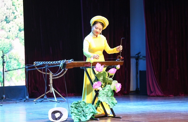 A musician play Vietnamese traditional đàn bầu (a monochord zither) at the opening ceremony of the Week of Vietnamese Culture in Cambodia 2024 on May 21. — VNA/VNS Photo