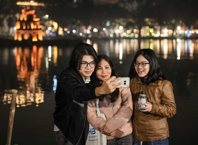 People take commemorative photos at the moment of welcoming the Year of Bính Ngọ by Hoàn Kiếm Lake.