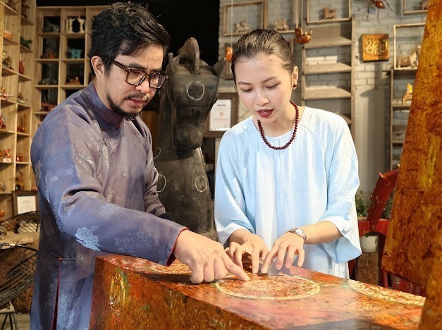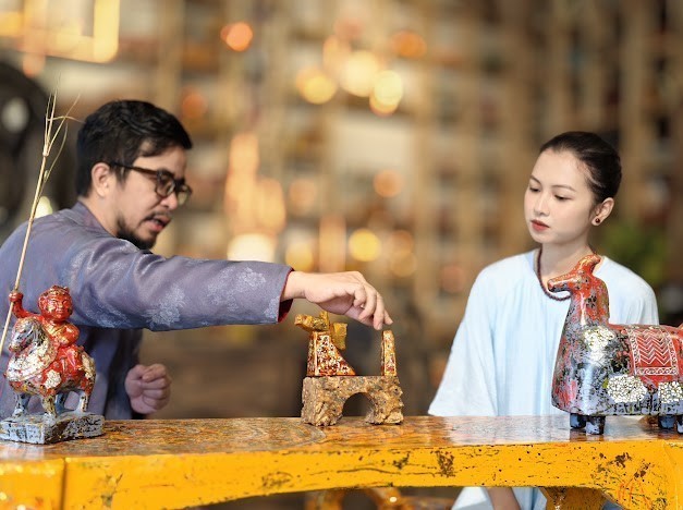 Meritorious Artisan Nguyễn Tấn Phát presents the lacquer techniques used in the “Gióng” collection.