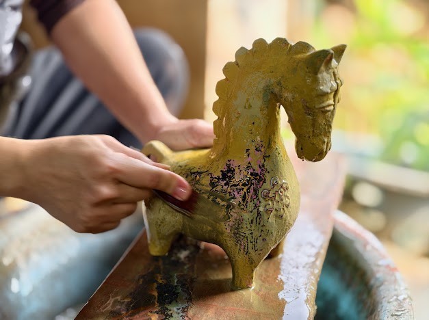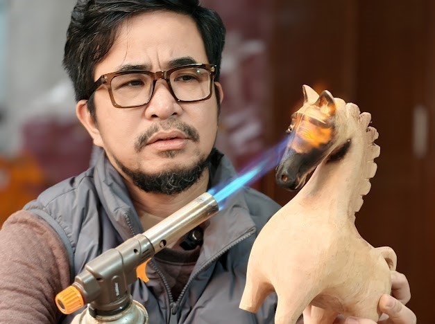 Meritorious Artisan Nguyễn Tấn Phát applies lacquer to a horse sculpture.