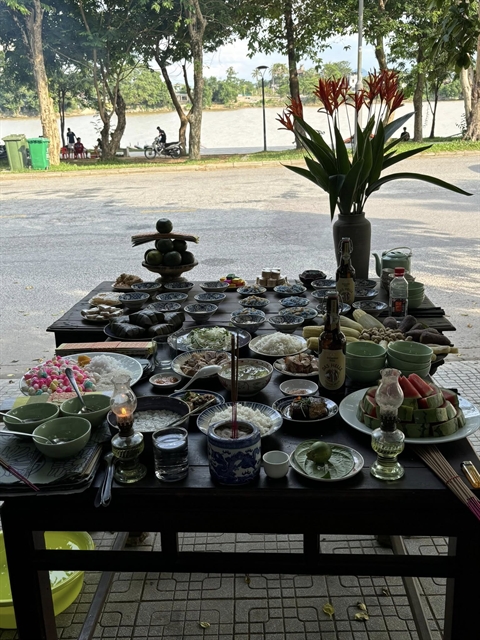 NOT FORGOTTEN: Food and fruit offerings made by Huế citizen Thái Kim Lan on May 23 to pray for the people of Huế who died defending the royal citadel. Photo courtesy of Thái Kim Lan