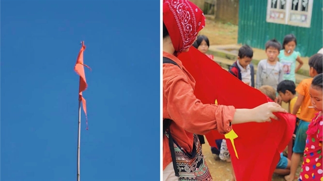 A viewer brought a new national flag to Cù Vai Village after watching Tiến’s vlog. Graphic by Minh Phương